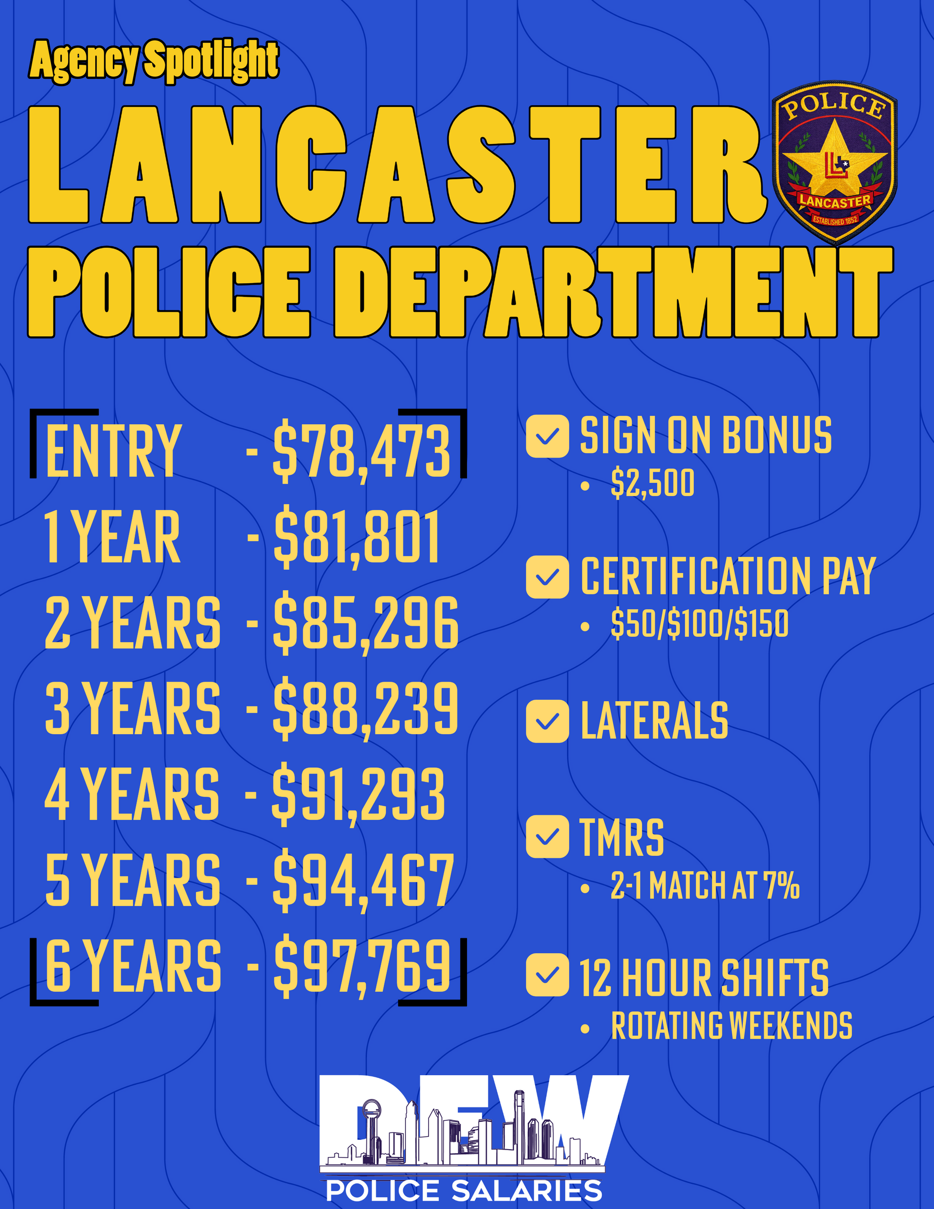 Feburary 3rd, 2025 If you’re looking for a rewarding law enforcement career with excellent pay, benefits, and opportunities for growth, the Rockwall Police Department is now hiring and actively seeking new officers to join the team. Rockwall isn’t just offering a job — they’re offering a career path where you’ll be part of a family and a community that values its officers. Competitive Pay & Career Growth Rockwall PD offers one of the strongest step pay structures in the DFW area. New officers start at $84,448 and can advance through the steps up to $107,627 . The department also has a lateral entry program , allowing experienced officers from other agencies to join at higher pay steps based on their prior service. Step Plan Overview: Step 1: $84,448 Step 2: $88,628 Step 3: $93,059 Step 4: $97,656 Step 5: $102,502 Step 6: $107,627 Additional Pay Opportunities On top of the base salary, officers can earn additional pay for their education, certifications, and skills: Certificate Pay: Up to $2,000/year depending on level (Intermediate, Advanced, Masters) Education Pay: Up to $2,000/year (Associates, Bachelors, Masters) Shift Differential Pay: 3% evening shift, 6% night shift Bi-Lingual Pay for officers fluent in additional languages Benefits That Support Officers Rockwall PD goes beyond pay by offering benefits designed to take care of its officers both on and off the job: Duty and backup weapons issued (with ownership after 5 years) Local gym memberships provided 12-hour shifts for better work-life balance Outer vest carriers supplied Paid dry cleaning of uniforms Why Rockwall? The Rockwall Police Department is proud of its culture and commitment to community. Their slogan says it best: “We’re more than a career, we’re a family.” From the first day you join the department, you’re supported by leadership, your fellow officers, and a community that respects law enforcement. Ready to Apply? If you’re interested in joining Rockwall PD, you can learn more about their pay plan, benefits, and hiring process at: π www.rockwallpolice.org/career.asp For direct questions, you can also reach out to Sgt. Steven Brassil at (972) 772-6727 or sbrassil@rockwall.com .