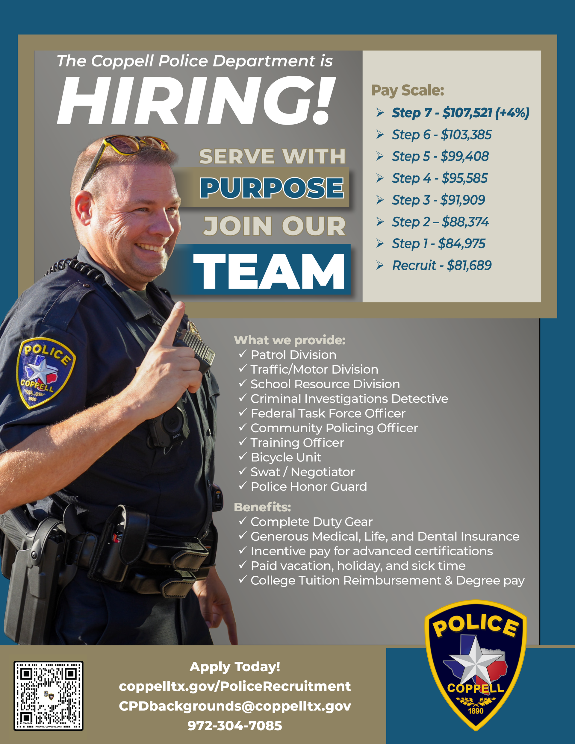 December 13th, 2025 Farmers Branch Police Department Is Hiring! Looking for a rewarding career in law enforcement with competitive pay and excellent benefits? The Farmers Branch Police Department is currently hiring police officers and welcoming both new recruits and experienced laterals. π° Competitive Pay: Entry Pay: $84,440 Top Out Pay: $109,959 (in just 7 years!) Lateral Entry: Up to $109,959, depending on experience π Benefits Include: $5,000 hiring bonus 12-hour shifts with paid time off 2:1 TMRS retirement Health, dental, vision, and life insurance Education, certification, and language pay Tattoos and beards allowed! Farmers Branch PD prides itself on “Excellence in Service” — and that excellence starts with you. If you’re ready to take the next step in your career, apply now at FBTXCareers.com or scan the QR code on the flyer. Farmers Branch Police Department