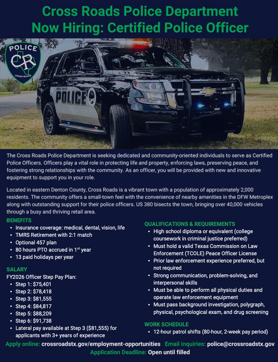 Visit https://www.crossroadstx.gov/employment-opportunities, email police@crossroadstx.gov, or call the Cross Roads Police Department at 940.441.4226 to join a professional, growing police department. We are guided by the values of integrity, service, teamwork, accountability, and respect.